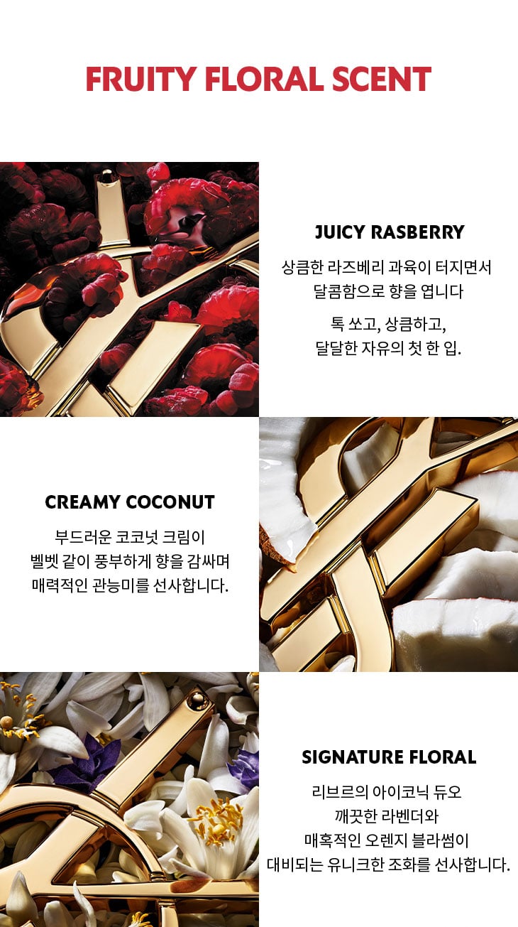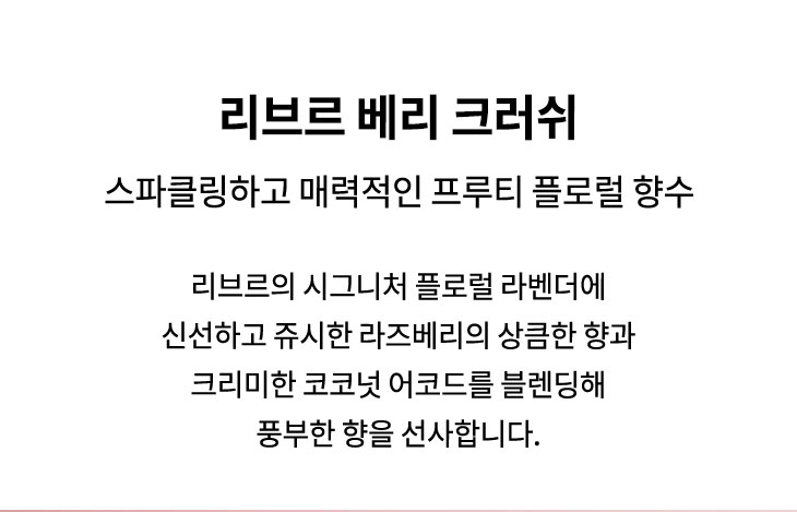리브르의 시그니처 플로럴 라벤더에 신선하고 쥬시한 라즈베리의 상큼한 향과 크리미한 코코넛 어코드를 블렌딩해 풍부한 향을 선사합니다.